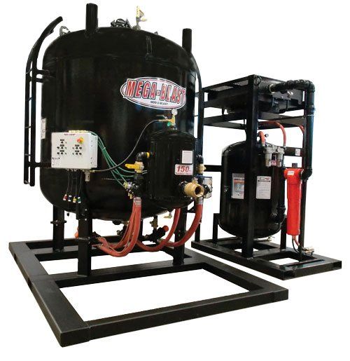 are available in two standard sizes, either 100 Cu. Ft. (2800 Litre) or 160 Cu. Ft. (4500 Litre) capacity. Custom engineered machines are also available. High-volume and high-production are standard with Mega-Blast units, all vessels are rated to 150 psi working pressure. We manufacture each vessel using 3/8” metal on the tank shells and 1/2” metal on the tank heads. All Mega-Blast vessels are CRN-Registered, National Board Certified, U-Stamped (ASME), and A-Stamped (Alberta).